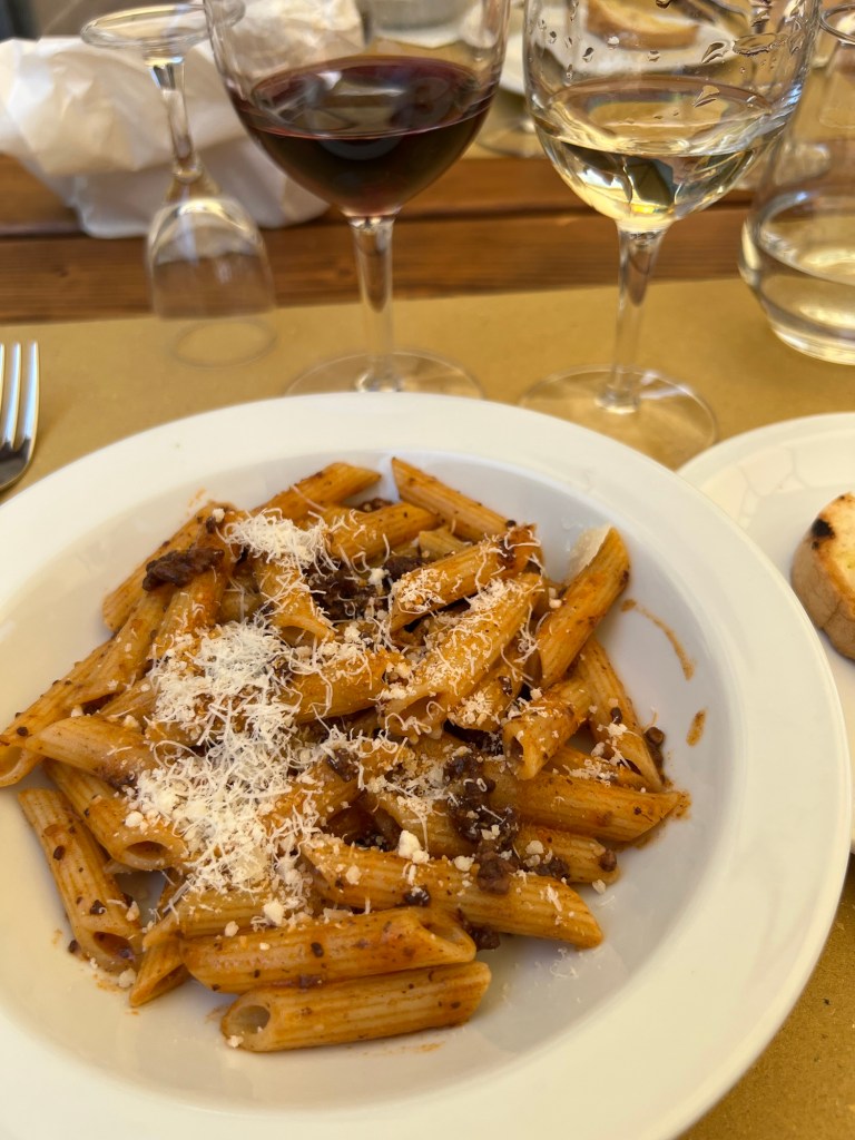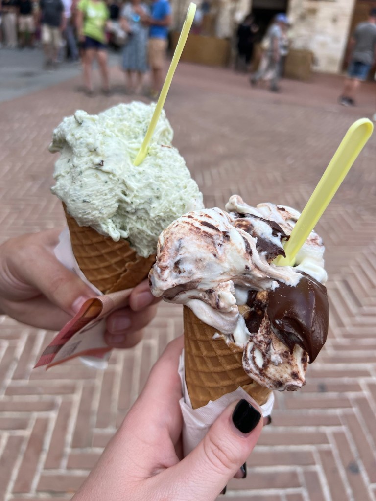 This was our favorite Tuscan town! San Gimignano is straight out of a movie. It is called the Town of Fine Towers and is a medieval town known for their fourteen presevered towers. If I could go back I would have stayed a few days here. It was so beautiful and so many shops to explore in this little town. We ate lunch at a winery which had incrediable views of the towers in the distance. The winery we ate at was to die for and they had the very best wine in all of Italy! We bought bottles and had them shipped home. It’s called Fattoria Pogggio Alloro. It is about 5km away from San Gimignano and I HIGHLY recommend going! The lunch was spectacular and they were serving about 60 people and it came out piping hot. We had a ragù pasta which they said is using the local in season meat in a red sauce and let me tell you this dish changed my life. We also had bread with extra virgin olive oil, salad, meats and cheeses, their Chianti wine and Vernaccia Di San Gimignano wine and to end the meal we had digestivo and biscotti. Back in town of San Gimignano, there is also the best gelato we had in all of Italy! And this place actually won the Gelato World Champion in 2006/2007 and 2008/2009 and it was seriously the best we had our whole trip! It’s called Gelateria Dondoli and it is in the Piazza della Cisterna. There is always a super long line through the plaza (it moves pretty quick) and it is SO worth it! The best one we tried was the Nutella gelato.