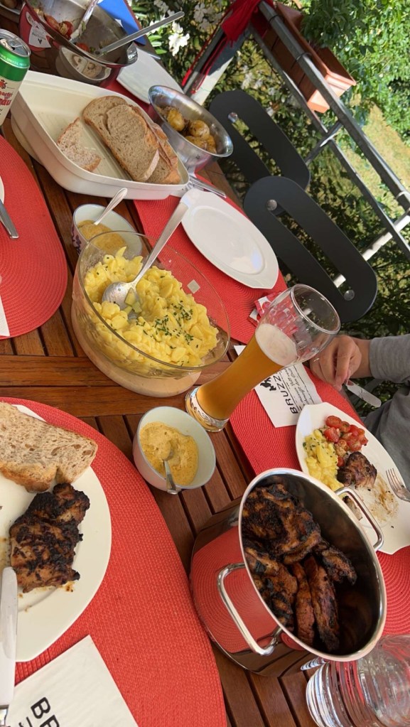 We had some delicious food while in Germany! My friend made Maultaschen which is a German dish that is a meat mixture with vegtables in a pasta dough. She cooked it with eggs and it was SO good, I tried to make it when we got back into the USA and it was okay but nothing like what we had there. Her husband’s family also did a BBQ and all the food was so wonderful. We also went out to a Turkish restaurant. I’m not really sure what we got because our friends ordered for us but man oh man it was SO good! They said that Turkish food is the most popular food in German that isn’t German food so there are Turkish restaurants everywhere. We compared it to how Mexican food and restaurants are here is the USA. I am not a big beer drinker but when in Germany I recommend drinking all the beer! It was SO good and didn’t taste like beer we have in the USA. My friend’s husband took us bar hopping in the middle of the night and it was one of the most fun nights I have ever had! Drinking in public is allowed in Germany so we would go into one bar and get a beer to go and drink it while we walked to the next bar. We could not get over that even though people were out and about drinking in the middle of the night, there were no fights going on, nothing bad was happening and people were just having a great time. When you finish your beer you do not throw your bottle in the trash, you set the bottle next to the trash can so it can be recycled. People will come by and pick up the bottles because they get money when they are returned. It was such a different atmosphere than how the drinking culture is in America. It was a breath of fresh air to enjoy our time and not have to be scared of what people may do.