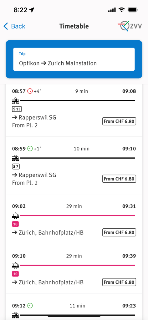 Above is what the app looks like while looking at your train times. At the top you enter where you are. We were at the stop called, “Opfikon” near our hotel and we wanted to go to “Zurich Mainstation” which is the main train hub in Zurich. Now right under that it says there are two trains coming that have similar ETA. The first one is train number S15 named “Rapperswil SG” it will be at your stop at 8:57 picking you up on platform 2 (Pl. 2). It is a 9 minute ride to Zurich Mainstation and will arrive there at 9:08. This ride will cost you CHF 6.80 (which is 6.80 in Swiss Francs).