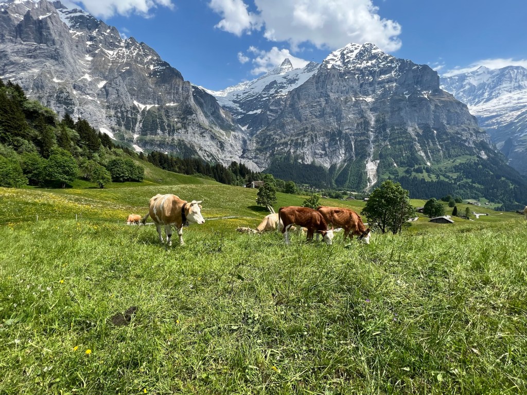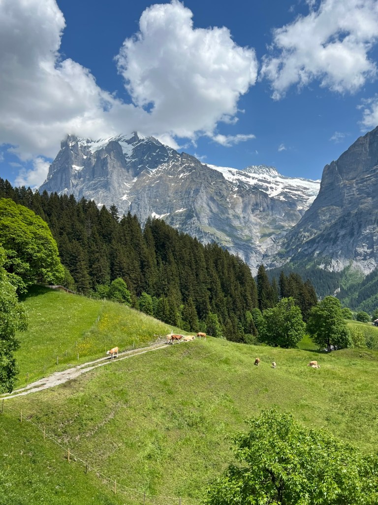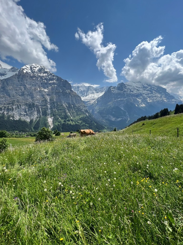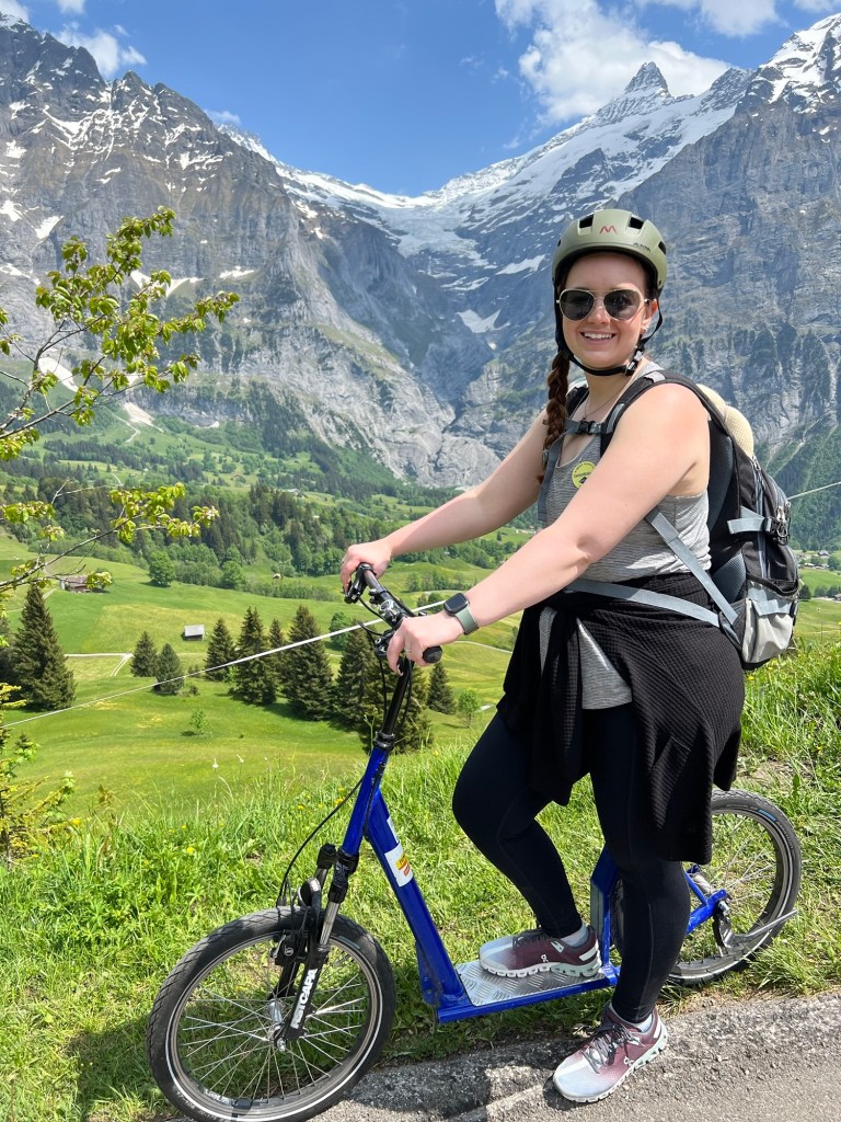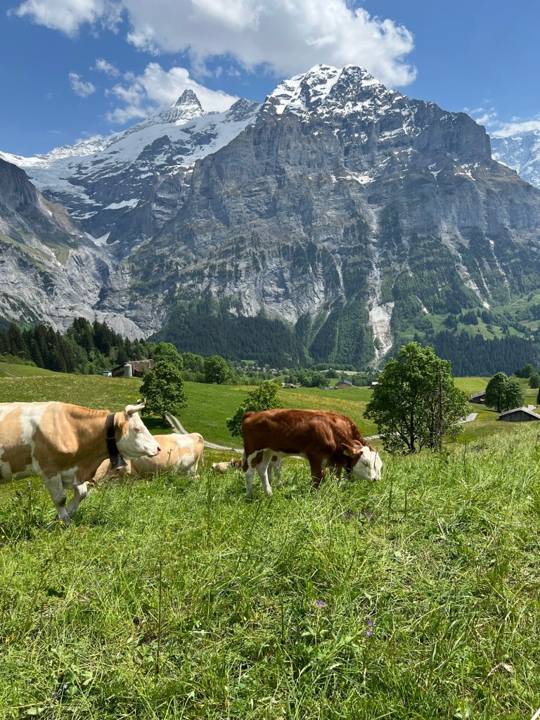 We didn’t really know what we wanted to do while we were in Grindelwald until we heard about Trottibikes and we decided we had to do it! We were able to walk from the train/bus station through the town until we got to the gondola. At the gondola we were able to buy our tickets (up the gondola and for Trottibikes). The gondola ride up had absolutely gorgeous views of the surrounding mountains. We got off at the first stop of the gondola and waited in line to sign the wavier to ride the Trottibikes. While waiting in line you want to grab a helmet that people leave in the baskets because you will not be able to ride if you do not show them you have a helmet. People were definitely fighting over the helmets and when they were all gone, people had to wait for more to be returned from the people doing the carts that were future up the mountain side. Best bet is as soon as you see a helmet being returned grab it! Once you sign the waiver they will give you your Trottibike and then you can head down the mountain. And boy oh boy it’s steep!!! At first it was so scary because you don’t get small hill to try out your balance or breaks. You are immediately thrown down a very steep mountain side and have to figure it out as you go along. I really wanted to take a video while going down but there was no way I would have been able to hold my phone and the handlebars as well. If you have a Go-Pro I would recommend bringing it on this activity! On the way down we were able to stop and see some Swiss cows who had on the traditional Swiss bells. We were able to take a break and soak in the views and sounds of Switzerland. As we continued down the mountain side on the Trottibikes, you end up riding your bike through the town and back to the base of where the gondola starts. This is where you return your Trottibikes and they also have restrooms on the side of the building. If you are an adrenaline junky, like me, this is the perfect activity to do and I would highly recommend it!!