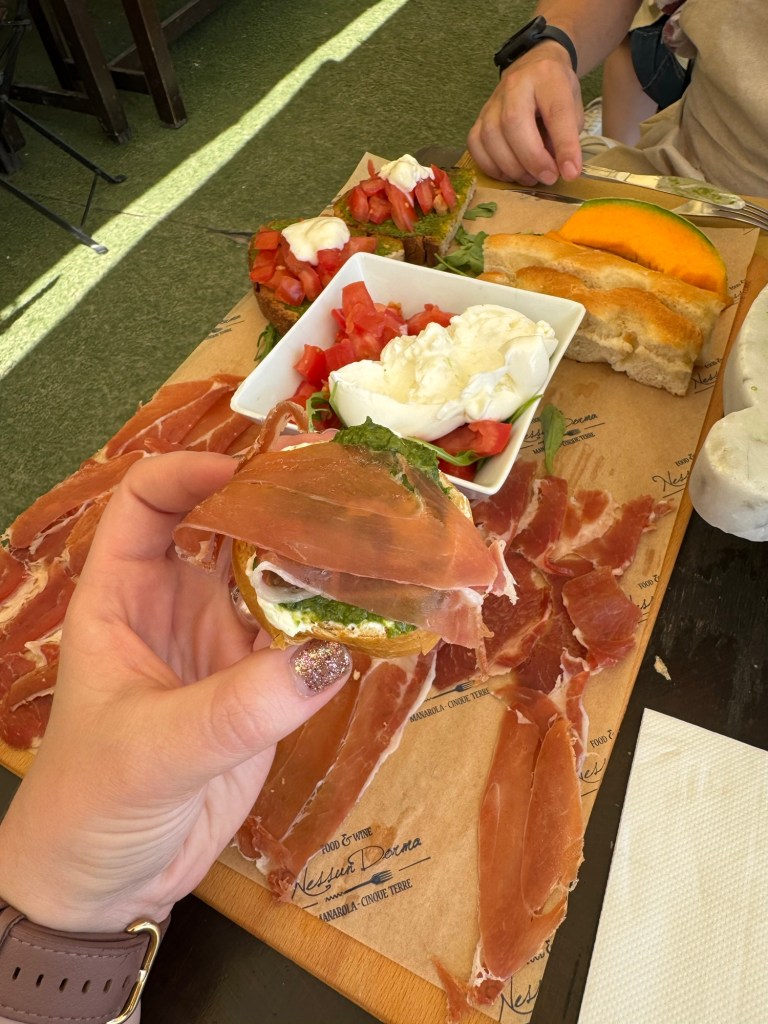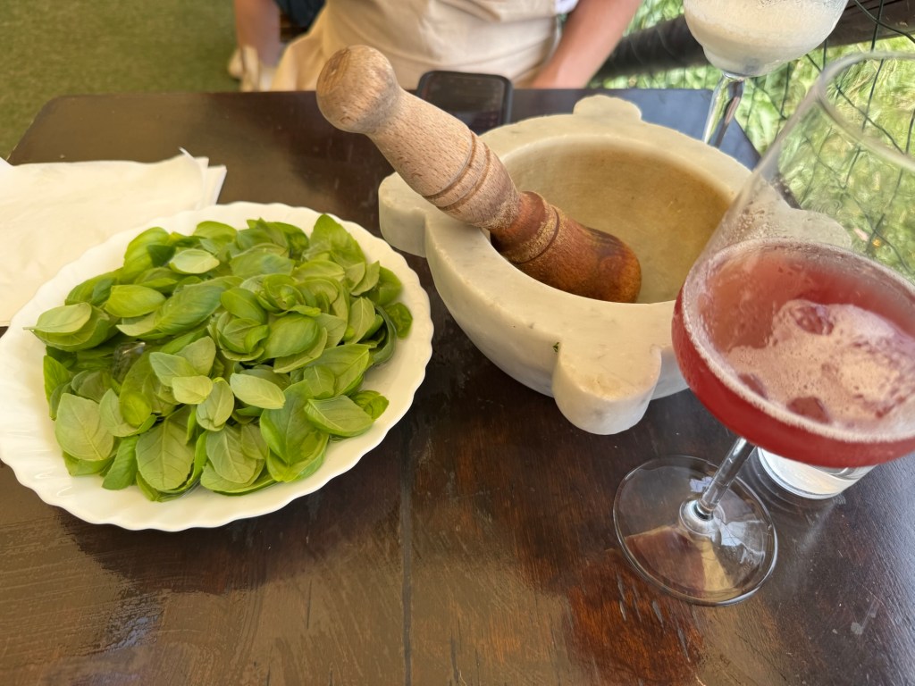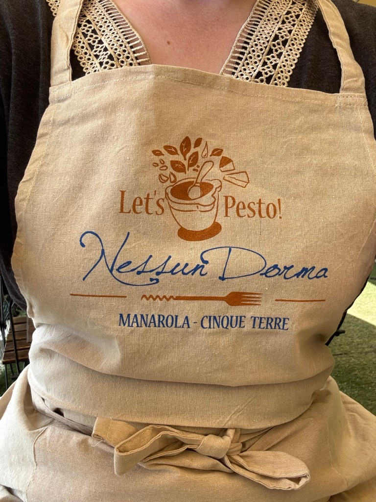 This was our second time in Manarola and we had to come back to experience a true pesto making class! It was SO much fun and we learned so much about the process of making pesto, quality ingredients and of course indulging in it. There are a few different pesto making classes in Cinque Terre, but when we were there a few years ago we saw Nessun Dorma’s class and it looked like so much fun we knew we were going to come back! I booked our tickets straight from their app and it was way more affordable than some of the other pesto classes I found on TripAdvisor. Included was the actual class of making the pesto, lots of wine, bread, meats, cheeses, fruits, aprons and they gave us a bottle of wine to go (which is their own local wine they make). They had more drink options you could purchase. I got a blackberry iced tea and it was delicious!