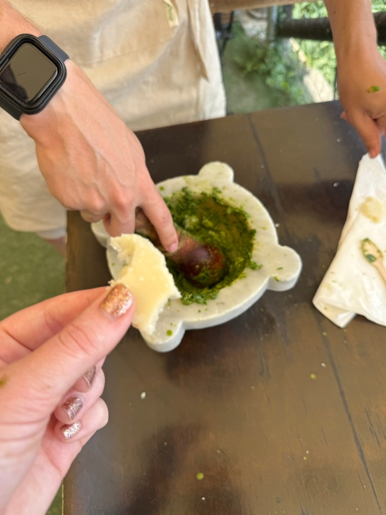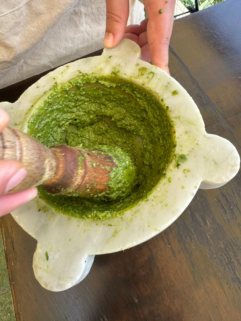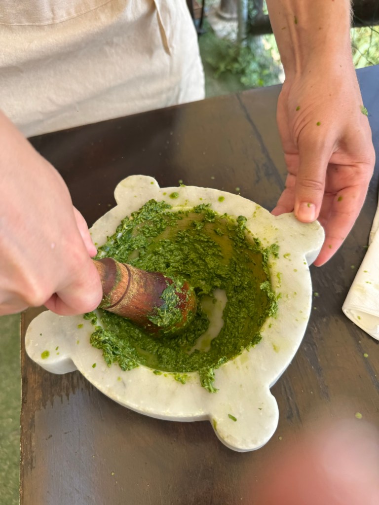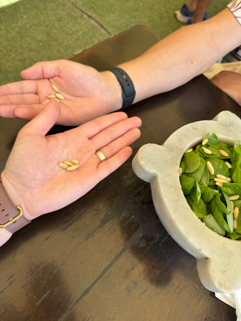 Step 4: After the leaves are filled to the top of the mortar you will add in pine nuts. 1 teaspoon per basil plant used. We learned that pine nuts are best if they are moist. So if you squeeze a pine nut and they leave your fingers wet, they are a good pine nut, if they do not then they are too dry and not the best to use. It can be difficult to find good pine nuts and they are very expensive. Once you add your pine nuts, you will use your pestle to smash the basil and pine nuts together. It works better if you smash them on the side of the mortar rather than straight down. Use the upward motion of smashing the basil and pine nuts on the side very intensely for several minutes. As you do this step repeat “Dai Dai Dai” very loudly and fast, this means “come on” in Italian like you are cheering someone on.
